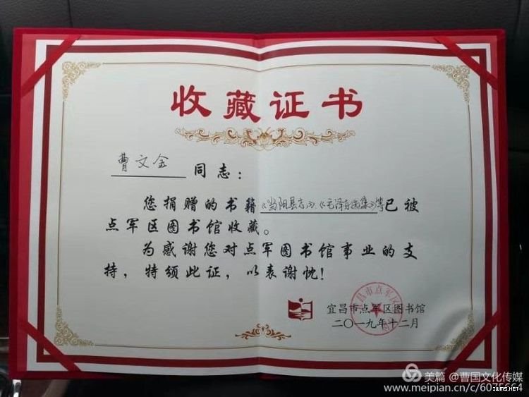【图书捐赠】捐出一份书香 传递一片爱心—— 区图书馆接受社会爱心人士曹文金先生捐赠图书12月27日上午,宜昌爱心人士曹文金先生来到区图书馆,现场捐赠《宜昌移民志》、《宜昌年鉴》(2003年)、《当阳县志》(1992年)等图书共计581册。区文化和旅游局吴局长、区图书馆姚馆长接受曹先生捐赠,后期我馆工作人员尽快将图书编目上架,欢迎广大读者前来借阅。
