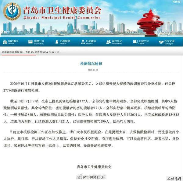 青岛卫健委12日通报,2020年10月11日我市发现3例新冠肺炎无症状感染者后,立即组织开展大规模的流调排查和分类检测,已采样277968份进行核酸检测。
